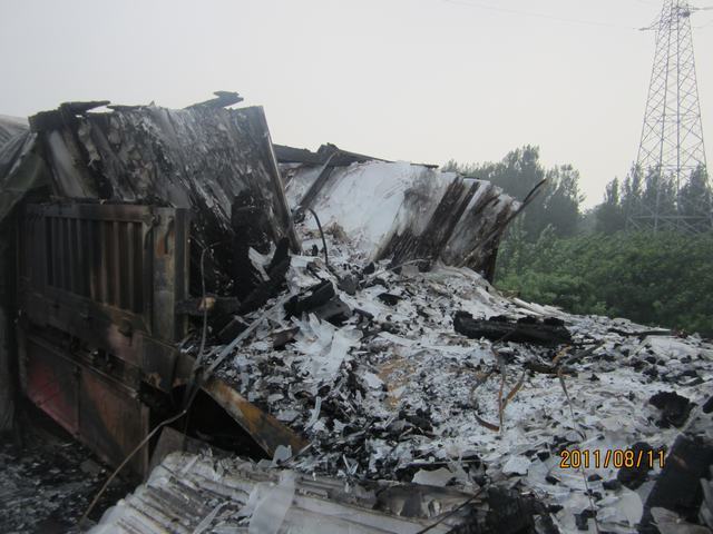 出险原因:轮胎突然自燃,导致车上货物80%烧毁;